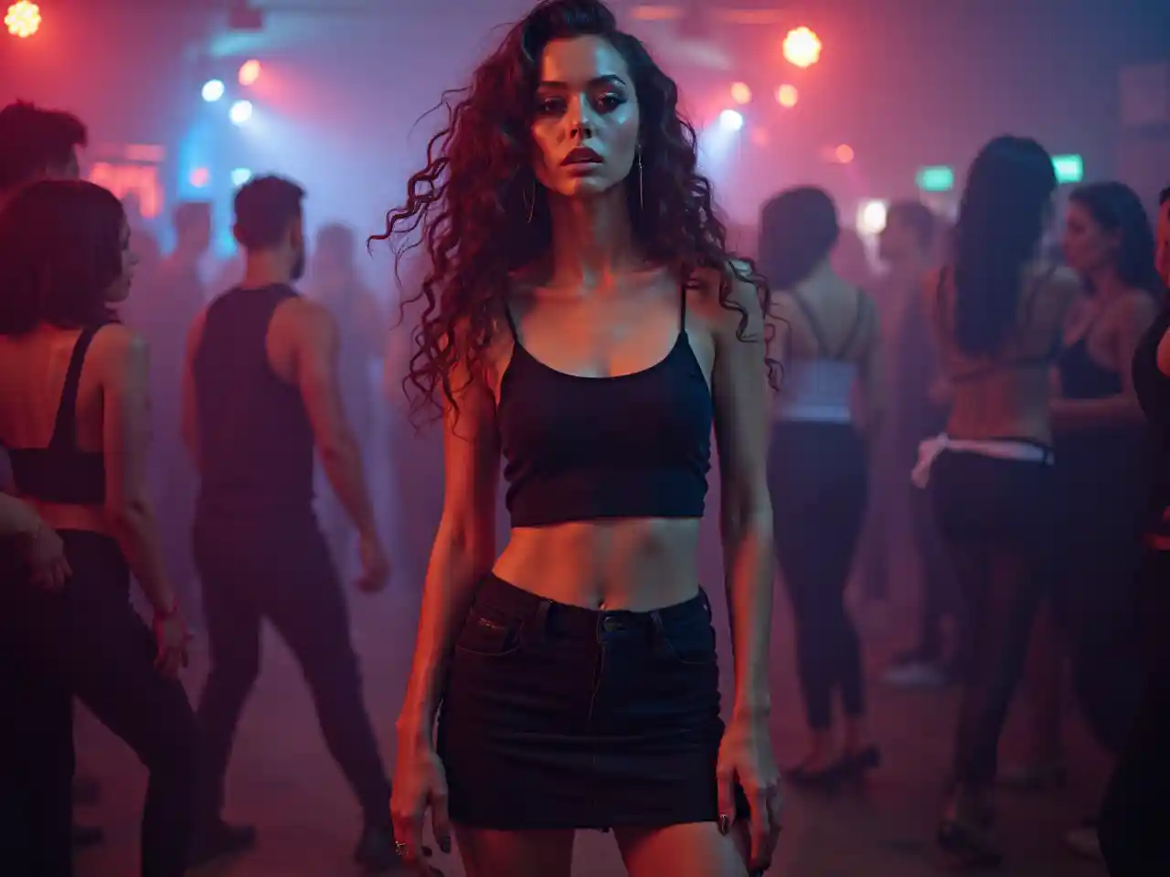 SawyerSexy fit brunette, sexet meget kort hipster kjole, kort tank top, nøgne skuldre, provokerende makeup, sexede øjne, dansende en disco, høje hæle, lange ben, overfyldt, krøllet hår, mave Burton ring