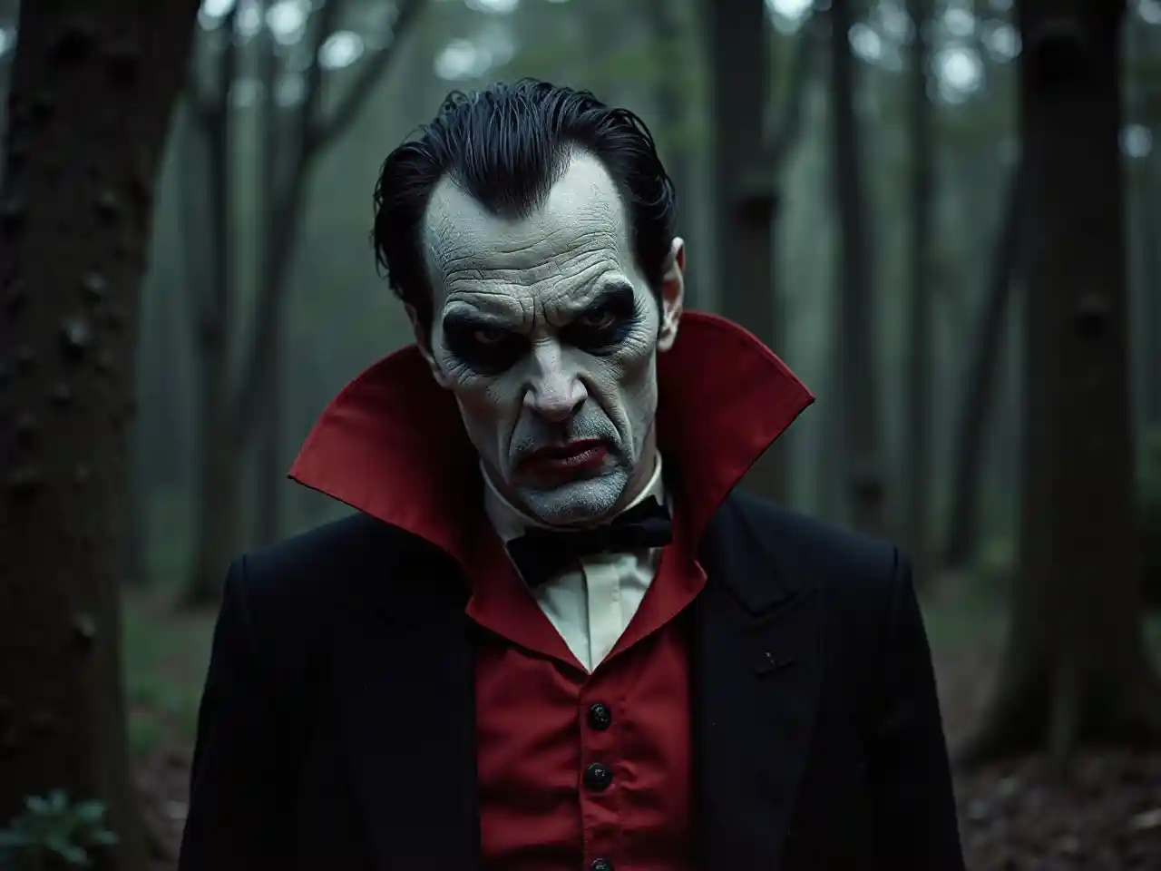 Jack Nicholson i et Dracula Halloween kostume, skræmmende makeup, mørk atmosfære, vintage stil, røde og sorte farver, høj detaljeret foto, professionelt foto skud, mod baggrund af en gammel uhyggelig mørk skov, kontrast lys, lyse farver, mørk atmosfære