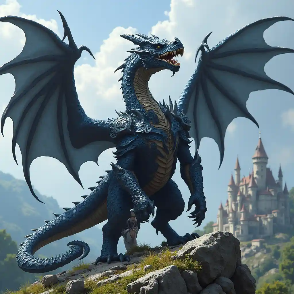 en detaljeret drage med rustning, sorte og blå vinger og en hale, med et slot i det fjerne med en lille landsby i baggrunden, drage kunst, koncept kunst