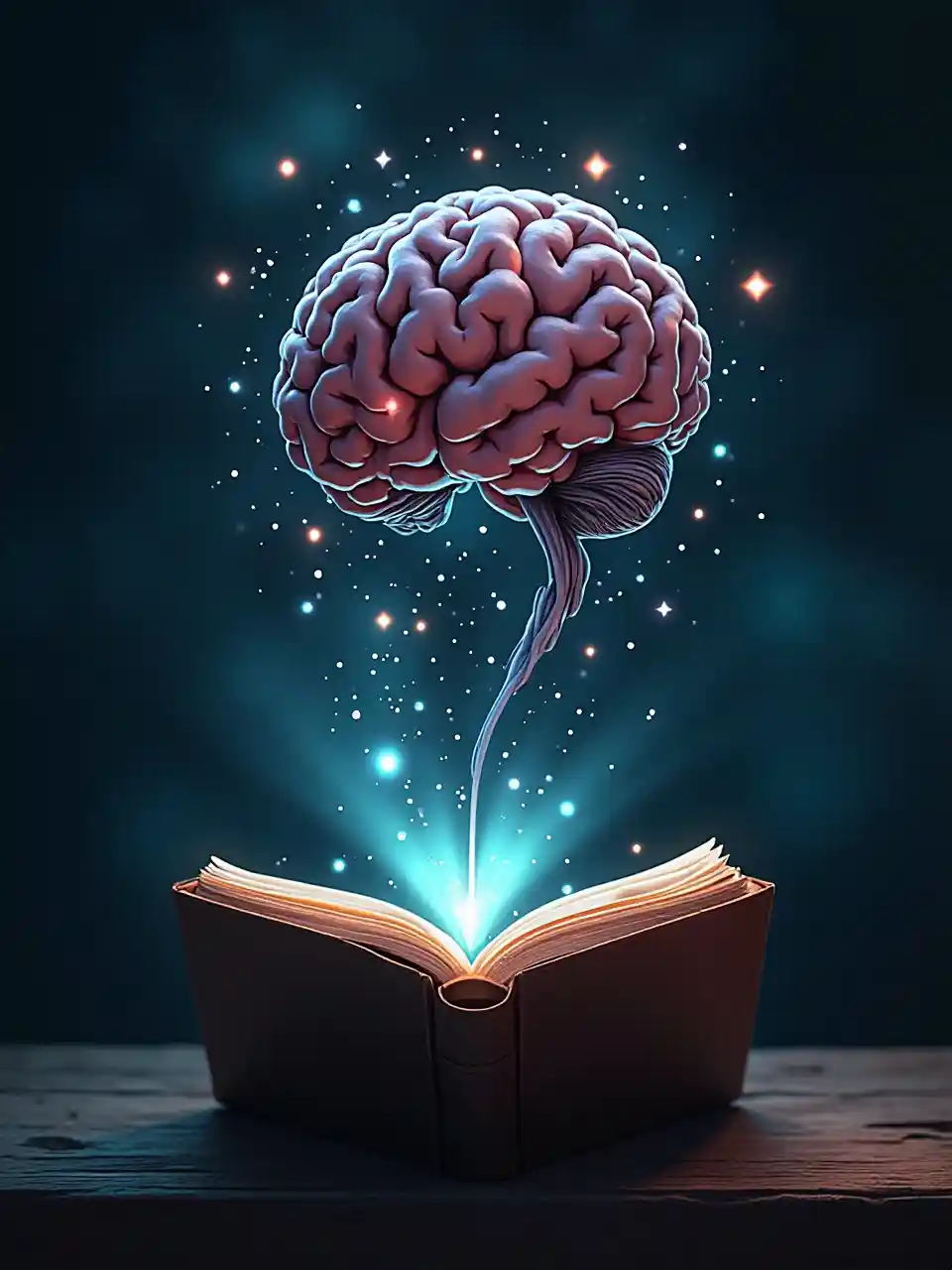 Skab et billede til et profilbillede, der sælger e-bøger. Der kommer en bog, en hjerne og flere interessante og mørke ting