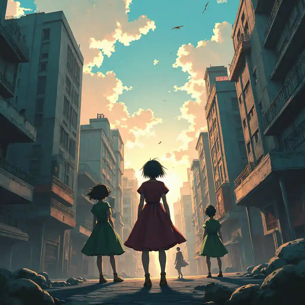 EmeryDystopian cityscape, rebels with elemental powers, akin to action-packed shounen anime.