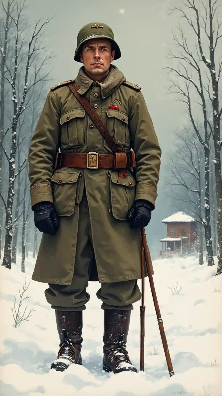 Mwangfinsk WW2 soldat vinter en farve træskæring