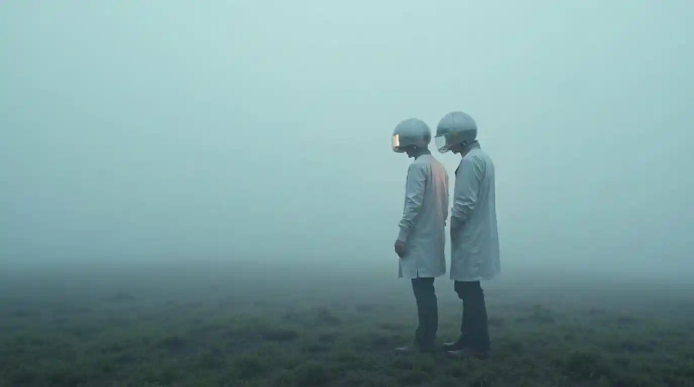 ColtenTåget landskab med to stående figurer i hvide frakker, der bærer store kuglehjelme med lyse orange lys, minimal detaljer, filmisk sammensætning