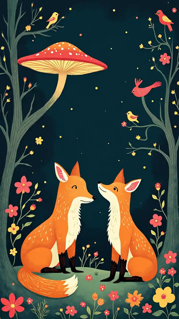 En skov scene om natten. To ræve, en siddende og en stående, er de centrale figurer, omgivet af utallige farverige blomster, svampe og træer. Over ræverne skiller en stor rød og gul svamp sig ud. Baggrunden er mørk, og den repræsenterer muligvis nattehimlen, der er plaget med små pletter, der kan være stjerner eller ildfluer. Man kan se fugle, herunder en lyserød, som sidder på grene. Hele scenen udstråler en magisk og fredelig atmosfære.