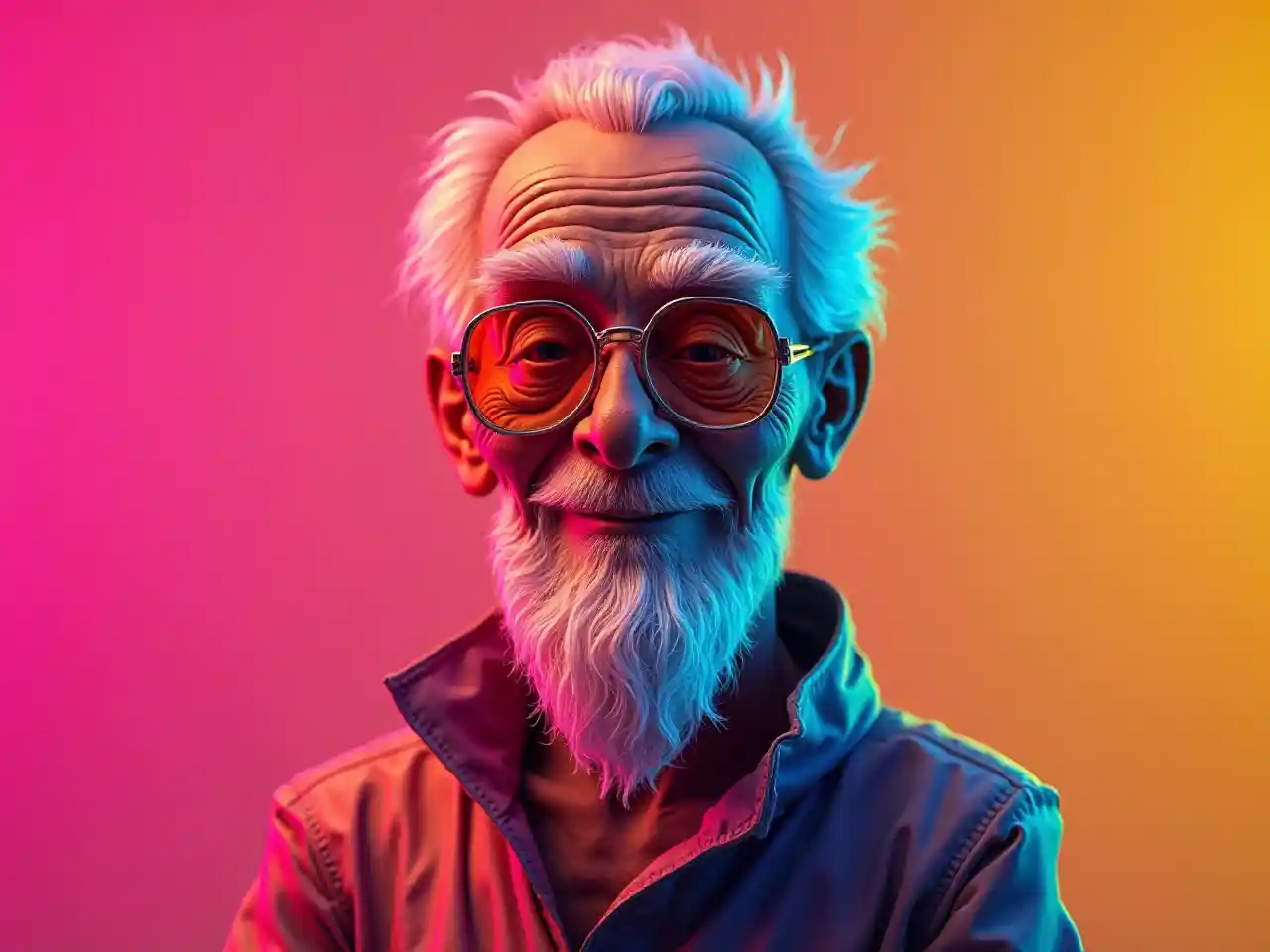 gammel sjov mand fra fremtiden, ultra realisme, super detaljerede, neon farver, bladomslag, professionelt skud, bladfotografering, lyse mættede farver, skarpt fokus, meget detaljeret, plads til kopi, enkel baggrund