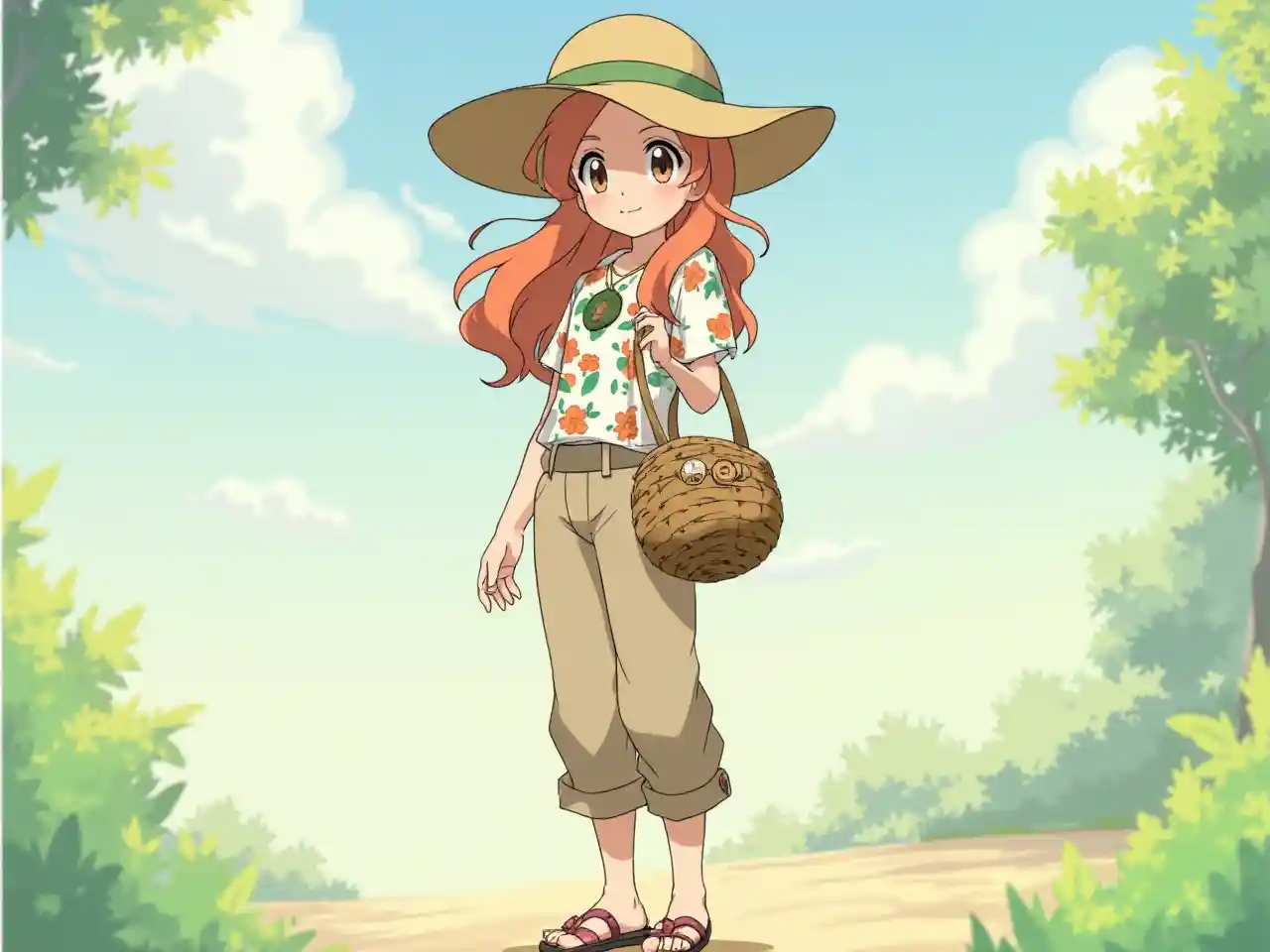 En teenager, elegant smidig krop, varm solkysset hud, lang bølgeblond jordbær hår delvis bundet med bånd, slående hassel øjne, tankevækkende rolig udtryk, let åndende blomster bluse, slidstærke knælange naturfibre bukser, lette fleksible sko eller sandaler, bred kant halmhat, lille vævet kurv, gartnerhandsker i lommen, blad pendant halskæde, pokemon anime kunst stil, fuld krop, stående, detaljeret tøj, detaljeret ansigt, detaljeret øjne, detaljeret krop.