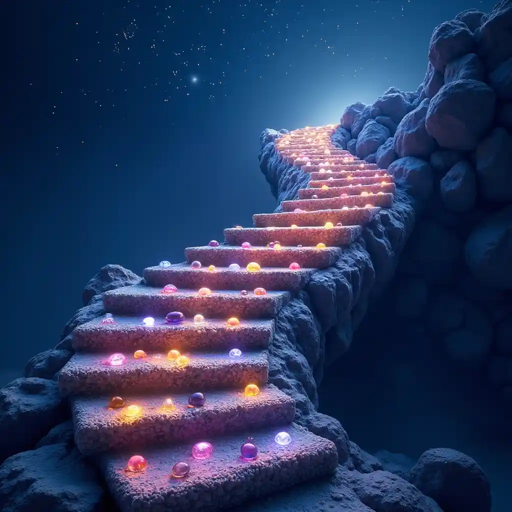 En glitrende trappe af ædelstene spiraler opad og udstråler en blød lys, mens ædelstene synes at skinne med et indre lys. Mod den dybe blå skumring strækker trappen sig ud som en skinnende bro, hvor alle sider glider i harmoni med stjernerne oven.
