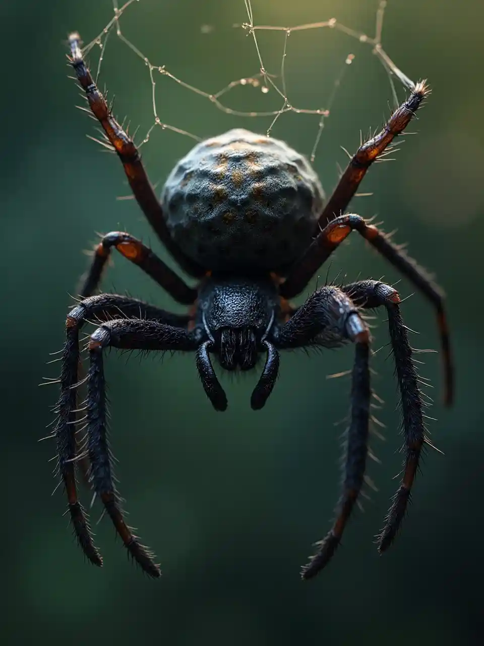 En majestætisk edderkoppe, der er flere gange større end livet, står over os og hænger på sit omhyggeligt udformede og indviklede net. Dens mørke, behårede ben hænger pænt, mens dens glitrende, mangesidige øjne glitrer med en anden verdens tiltrækning. Dens fine tråde gløder af dugdråber, som er vejet med en præcision der trod på. Dette levende billede minder om et omhyggeligt detaljeret fotografi, der indfanger naturens gådefulde vævere.