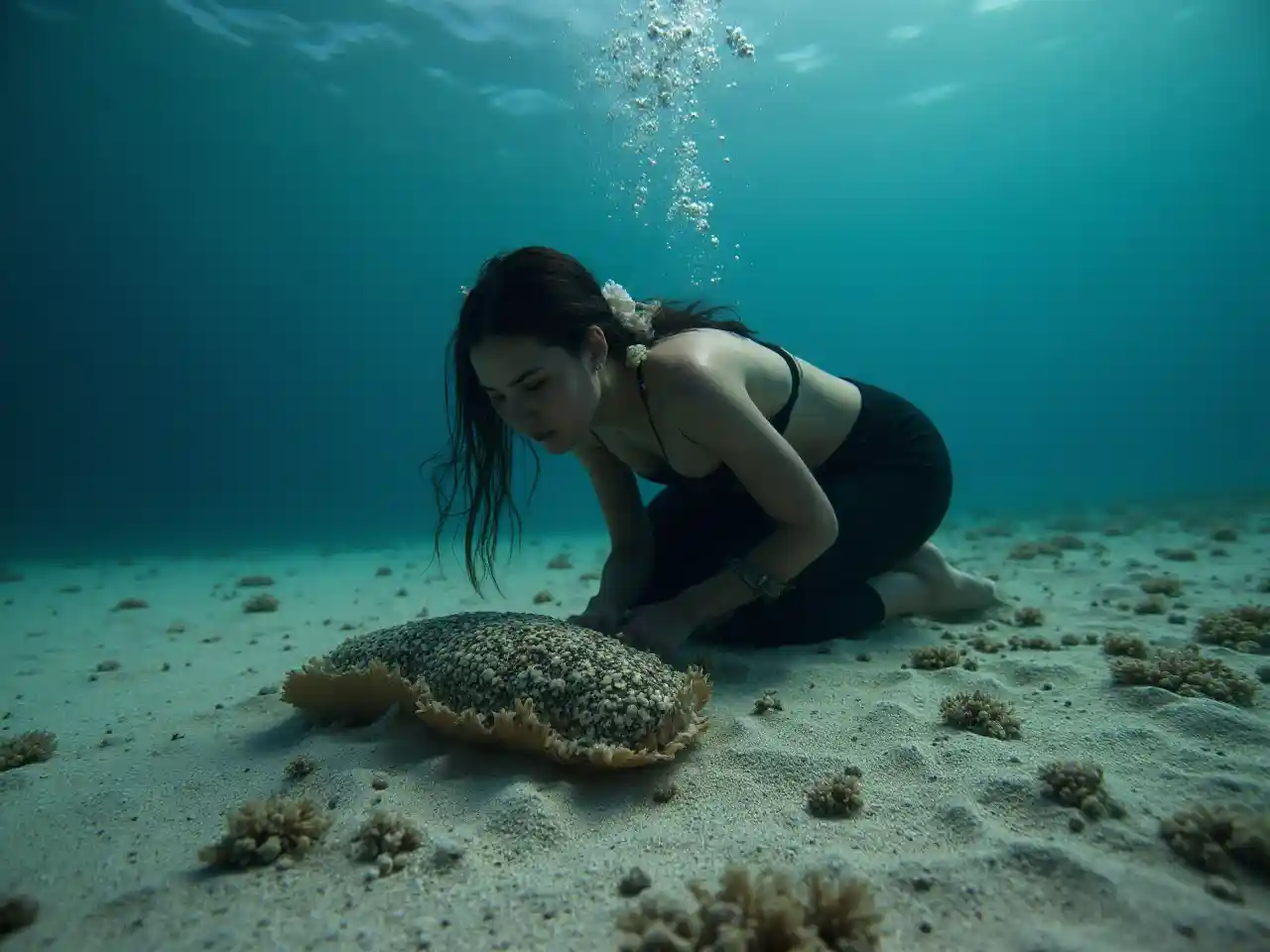 En gotisk kvinde med splittet farvet hår, der observerer havegurken på havbunden