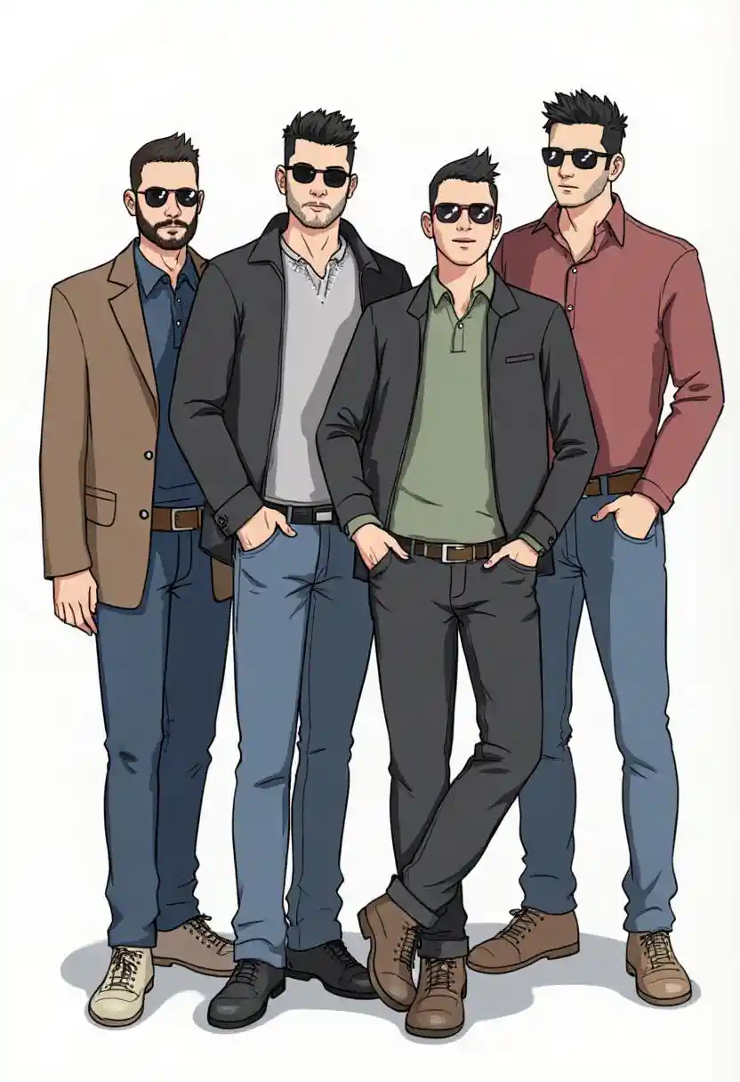 GTA-ish, 2D, (tyk omridsning: 1.2), 4drenge, flere drenge, meget kort hår, kort hår, sort hår, ansigts hår, solbriller, jakke, bukser, trøje, jeans, bælte, sho