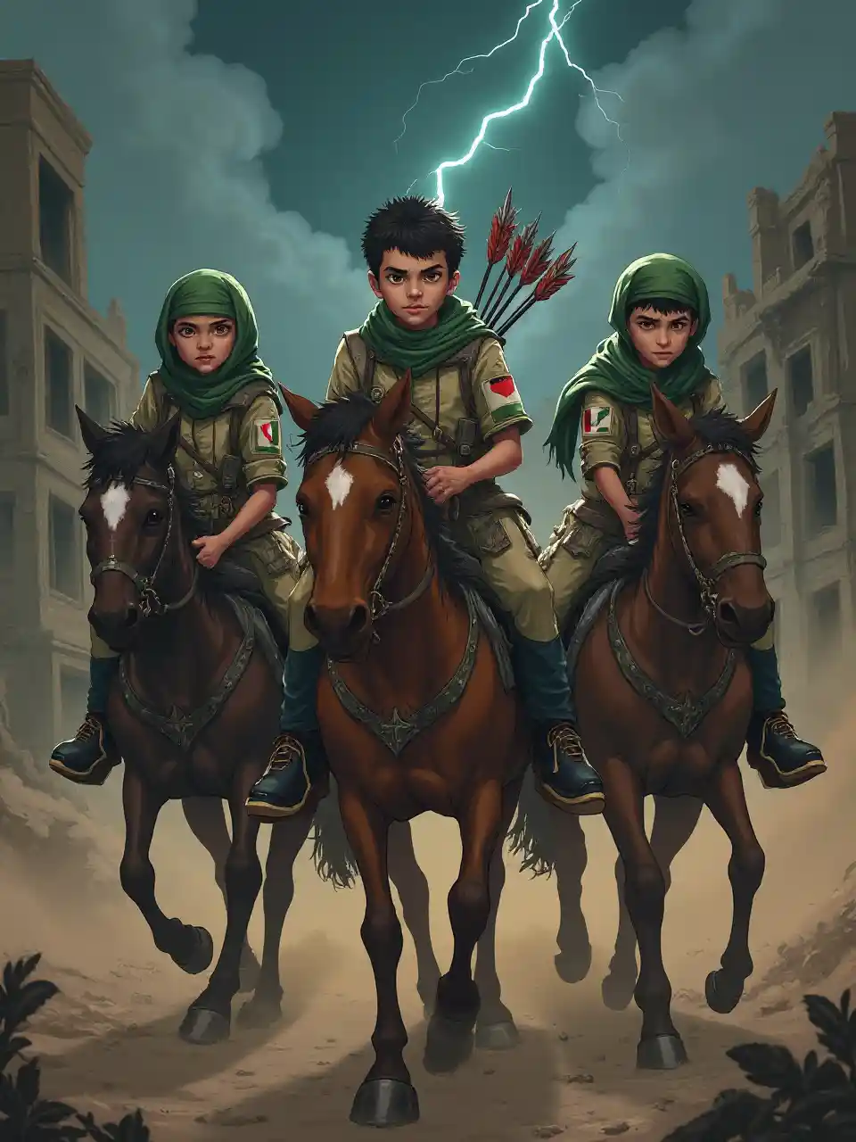 Karakterer: Tre palæstinensiske børn omkring 7 år. Rytterheste med intense, skarpe øjne. De bærer flere pile på ryggen. De bærer palæstinensiske militæruniformer med det palæstinensiske flags emblem på deres ærmer. Hoved pakket ind i traditionelle palæstinensiske keffiye. Baggrunden: Ødelagte bygninger. Mørk himmel med lyn. Støv hvirvler i luften på grund af hestenes hastighed.
