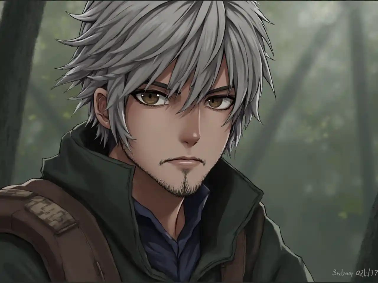 JacksonMenneske, hvidt og sort hår, hvidt og sort kort skæg, mandligt, brune øjne, jægerklæder