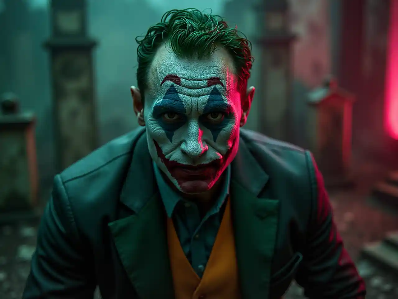 Portræt af Dwayne Johnson i en jokerkostume til Halloween, skræmmende makeup på hans ansigt, mørk atmosfære, vintage stil, grøn og lyserød farver, meget detaljeret foto, professionelt foto, mod baggrund af en gammel grus kirkegård, kontrast lys, lyse farver