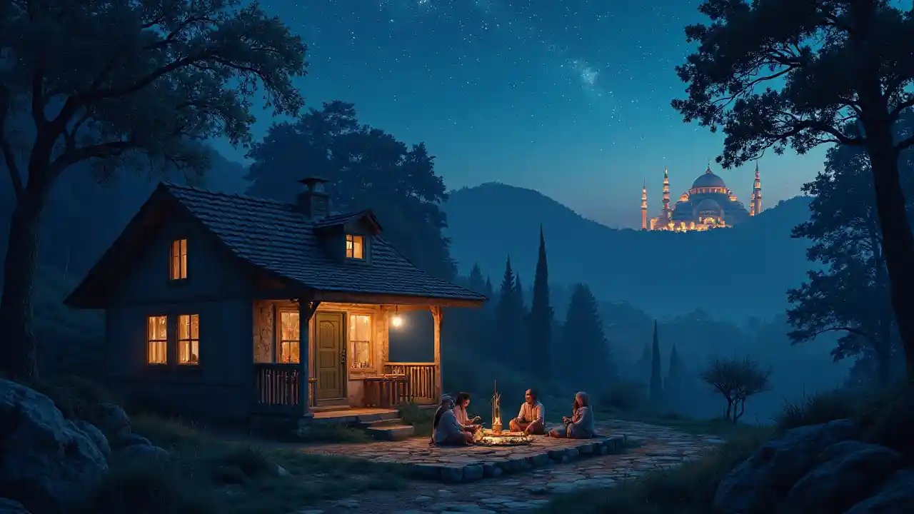 Langt ude i junglen et smukt landsbyhus en muslimsk familie der laver seher uden for deres hus en blå og sort himmel fuld af stjerner smukke træer en smuk muslimsk familie der spiser sammen uden for deres hus , lanterne , langt ude i moskeen skinner gravene