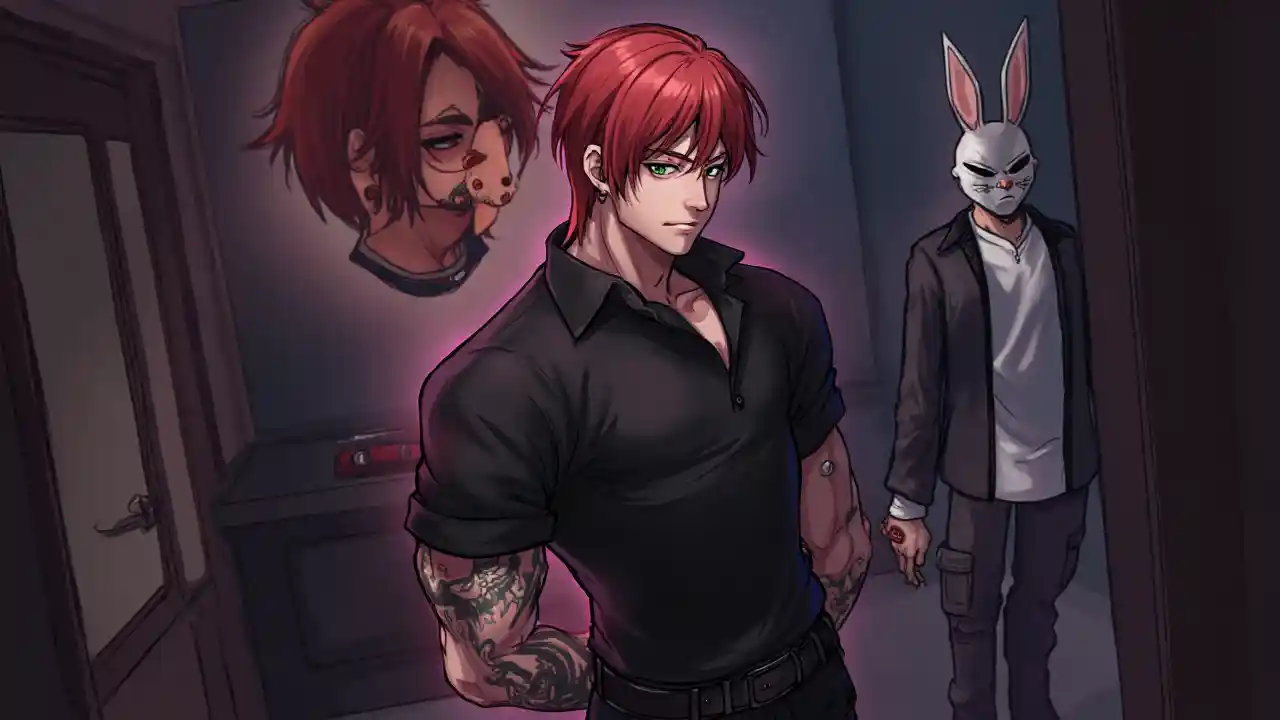 males only, veiny, bara,gay, masterpiece , best quality, perfect anatomy, perfect proportions, best aesthetics, high resolution, good colors, good shading,male focus, handsome male, newest, absurdres, highres , (5_fingers hand,perfect fingers hand ,NEGATIVE_HANDS), Masterpiece, 4K, High Definition, Amazing Quality, Best Quality, High Resolution, Latest, very beautiful, super detailed, dreamlike, perfect lighting, volume lighting, (darkness), shadows, (good shadows), depth of field, landscape, stunning aesthetics, movie lighting, movies, shadows, (good shadows), handsome,HD face,HD hands,HD eyes,HD mouth, danmei,clean style,detailed background,soft light (Artist: mazjojo: 0.65), (Artist: Dove 666: 0.75), (Artist: Zawar 379: 0.83), (Artist: remsrar: 0.65), (Artist: Bell ringing: 0.72), (Artist: Mi Shanmai: 0.73), skinny boy, asymmetrical bangs, short hair, long bangs,bangs pinned back, red hair,tall sharp nose,green dark eyes, brown skin,no lips,huge chest muscles, 6 pack abs, thigh with dragon tattoo,(Derek Kingsfield (Jock Studio)):1.3,Derek_Kingsfield,young boy(27 years old),thick fingers,no beard,sideburns, side view,from above,upper body shot,dutch_angle ,face focus,face close-up,paintniji,collared_shirt, black_shirt,belt bag, fitted_pants, leather_boots,indoors,2 boys,another man with a bunny mask on face standing behind staring him:1.3,another put hands behind back,a strange room, pinkish-purple light,whips hanging on the wall,strange masks hanging on the wall,a strange black door behind