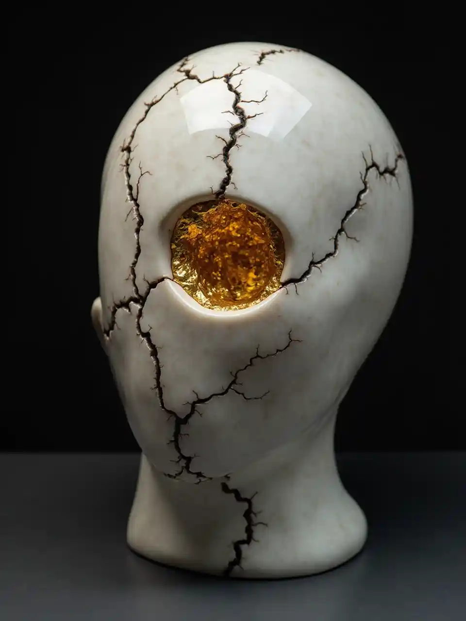 Et revnet hvidt marmorskulptur med guld inde, studio belysning, mørk baggrund