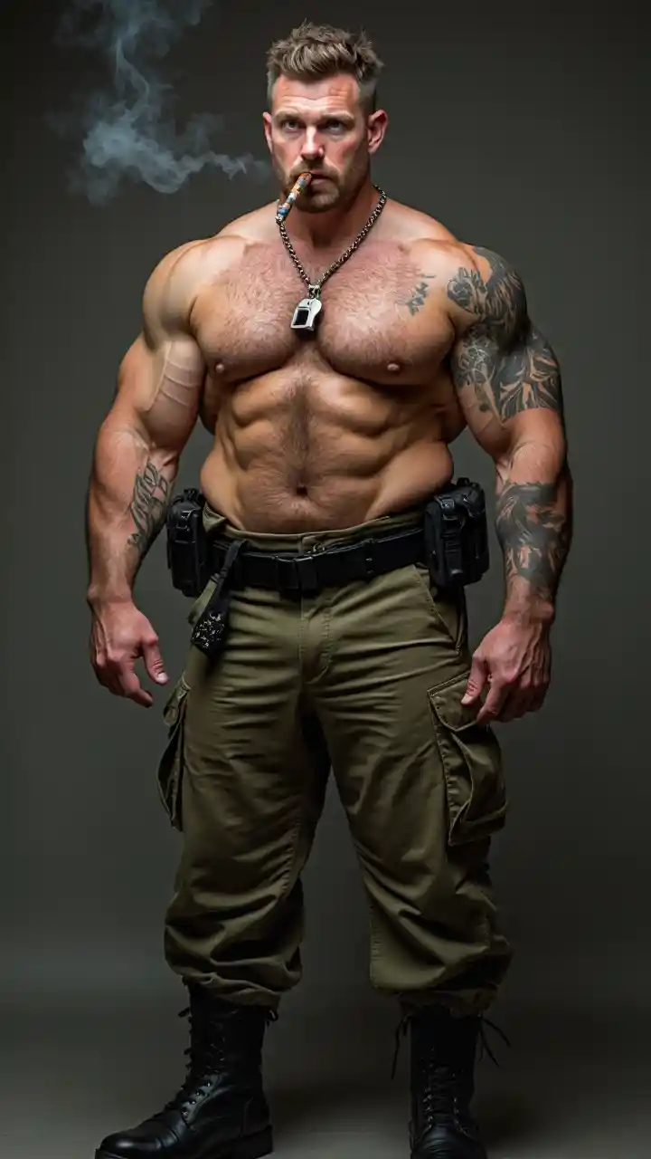 Udskræmt af kamp, lever denne store ond for en god kamp. Hypermaskulin hvid mand. Høj, muskuløs, muskuløs, bredt bryst, smal talje, store biceps, stærke ben, vægt, olympisk krop, stor mand. Kønne ansigt med tung 5 time skygge, stærke, tykke øjenbryn og firkantet, udhulet kæbe. Kort, lysbrunt hår, krøllet og skævt ovenpå. Langt kamoufleringsbandana bundet om panden. Storslåede, intense blågrå øjne. Hårede og hårede på bryst, krop, ben, arme og især armhuler. Skjortefri, åben bryst. Amerikansk flag tatoveret på højre arm. Sølv hund-tags omkring halsen. Sort læderbælte, grøn camouflage træt bukser, sorte militære kampstøvler. Hele kroppen, biceps op og armhuler ud. En tændt cigar i munden. {\ pos (192,210)}