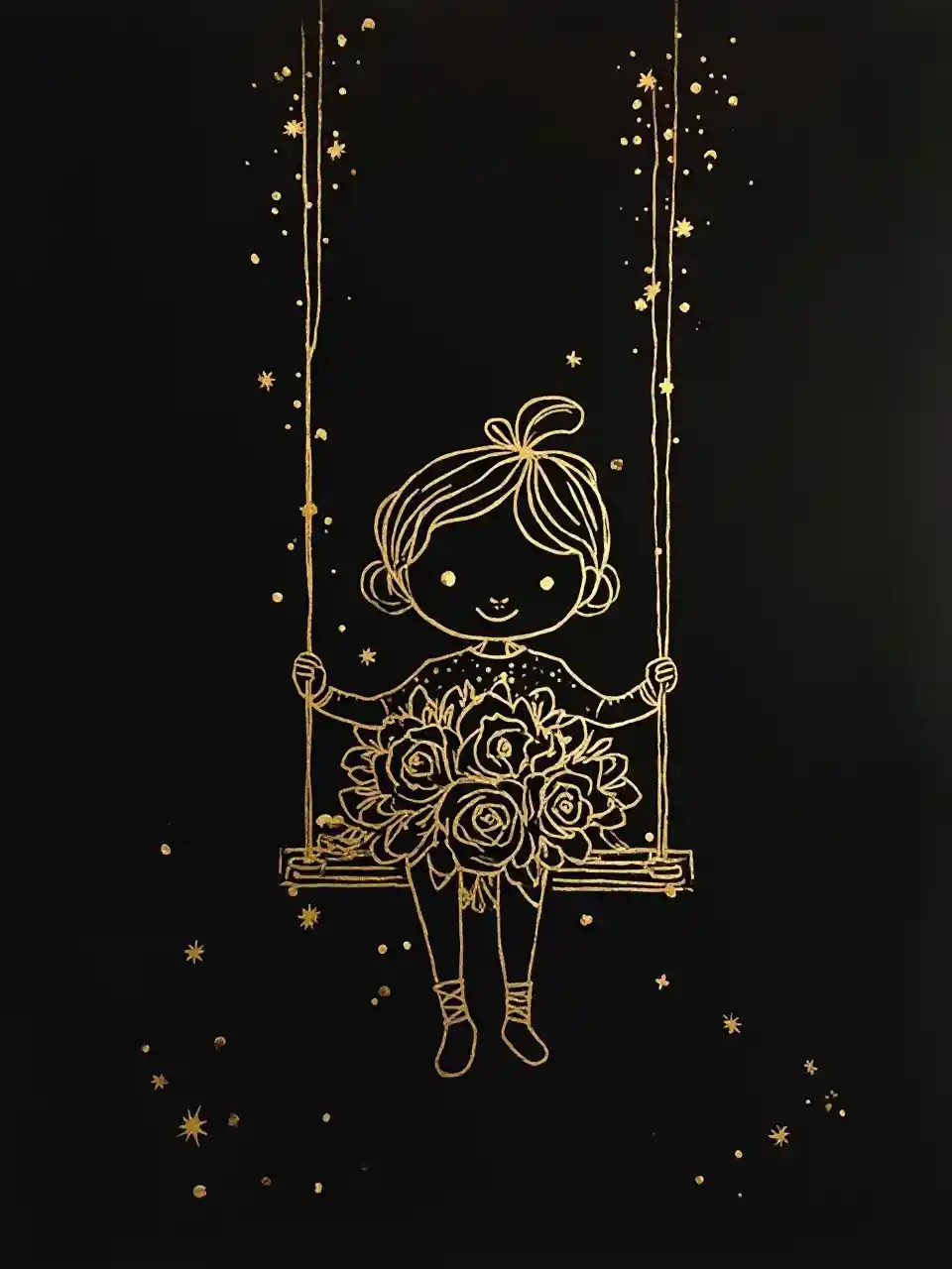 En minimalistisk, enlinet, metallisk guldtegning på en solid sort baggrund. Indrammet for at fange hele figuren af en sød, glad pige, der sidder på en gynge med en stor buket af blomster. Den yndige, kontinuerlige linje fanger hendes glade udtryk, blomsterdetaljer og milde bevægelser. Den er elegant stiliseret og minder om moderne guldfolie. Nøgleord: minimalistisk, guld blæk, sort baggrund, pige, swing, blomster, elegant, kunstnerisk.