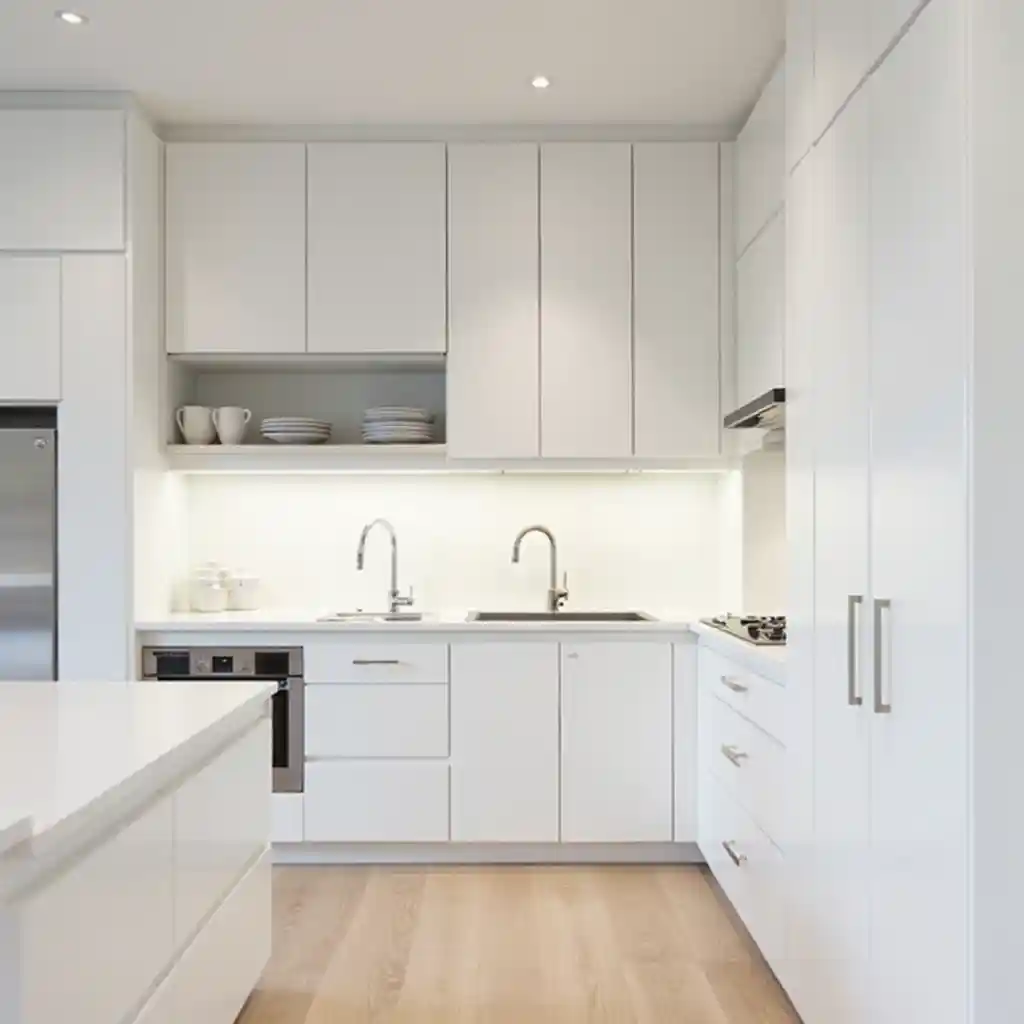 Et moderne, minimalistisk køkken med hvid finish og varme accenter