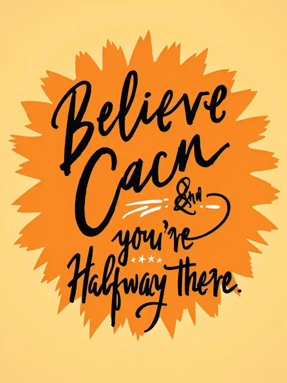 Svart motivationscitat: "Tro, du kan, og du er halvvejs der" på en orange sol.