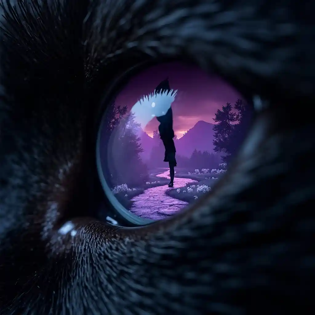 Et nærbillede af et stort, fascinerende lilla katte øje mod en mørk baggrund, med afspejlingen af et roligt landskab synligt i iris. Landskabet er præget af en snoet sti der fører op i bjergene, omgivet af frodig grønne planter og høje træer, mens en silhuetteret figur står på stien, hvilket skaber en følelse af mysterium og fortryllelse. Den sorte pels omkring øjet giver et tekstureret, mørkt lag til sammensætningen