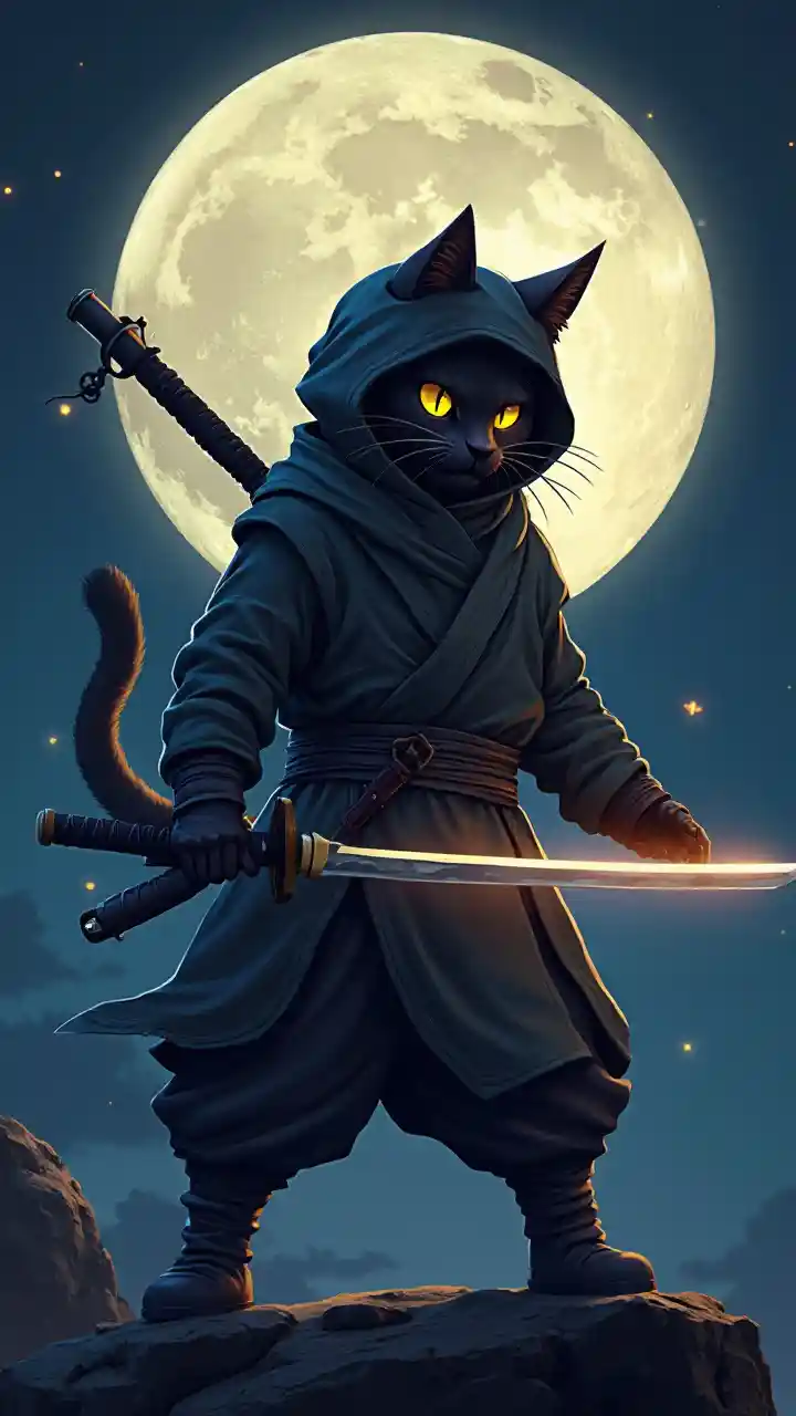 En ninja-kat holder et glødende sværd under fuldmåne.