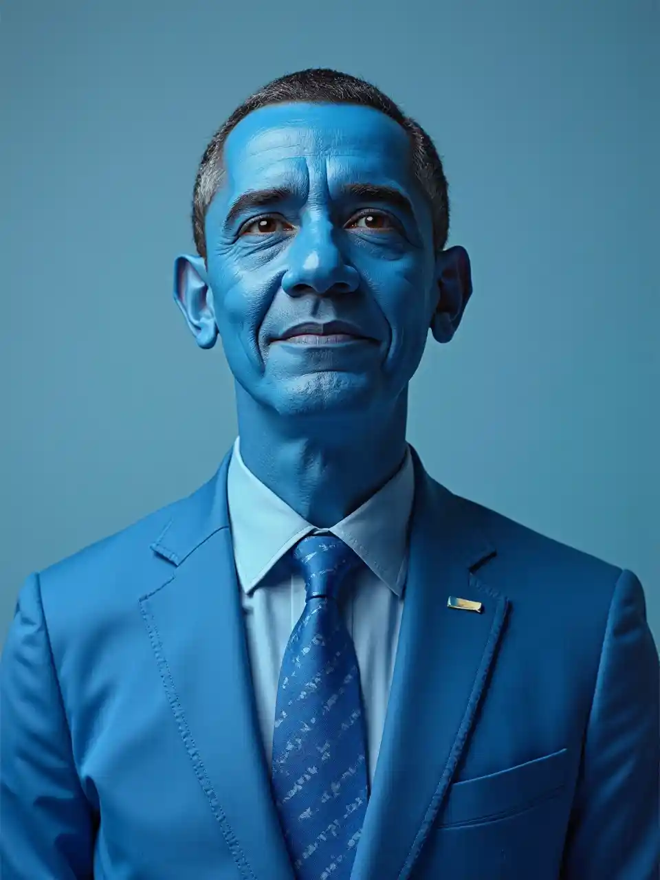 Barack Obamas hele krop og hoved malet med blå Doraemon. Billedet er stillet med Platon Antoniou fotograf tage et farvefoto. Obama stiller sig uden udtryk. Bare tomt stirre.