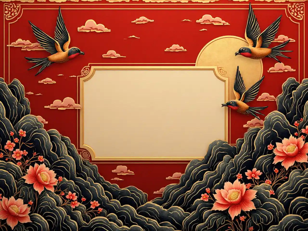 Et dekorativt kunstværk i orientalsk stil med tre svaler, der flyver over et landskab af bjerge, hvirvlende skyer og blomster. Baggrunden er en dyrebred farve med indviklede gyldne accenter, der giver en luksus og harmonisk følelse. Svalkene er smukt detaljerede med gyldne og sorte fjerstringer. Bjergene og skyerne er stiliseret med fine linjer og en blanding af sorte, grå og guld. Kompositionen har et tomt rektangulært rum i midten, indrammet i guld, egnet til at tilføje tekst eller andre elementer, der skaber balance og elegance