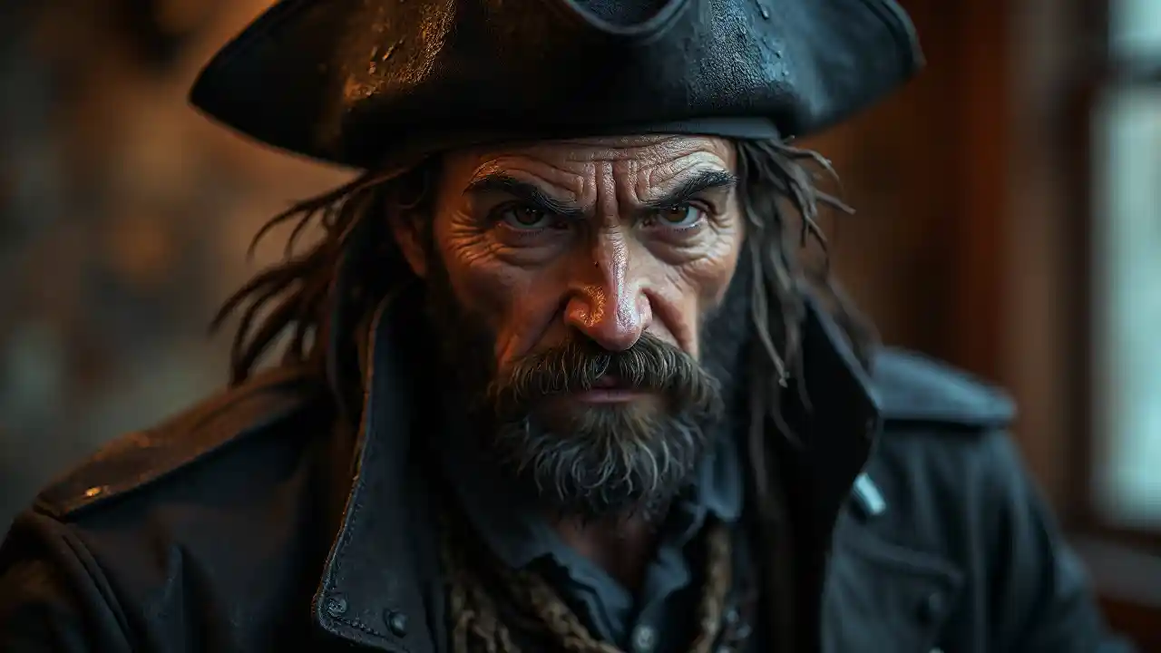 Et meget detaljeret portræt af en frygtet pirat, fanget i et halvt krop. Piraten har et foruroligende, skræmmende ansigt, dækket af dybe rynker omkring munden og. Hans hår er rodet, mørkt og fedtet, og det viser, at han er fysisk. Han bærer en deformeret sort filtpirathat, sammen med en indviklet vinterlæder. Piraten stirrer dyster ind i kameraet, hans udtryk er centreret og ildevaret. Inspireret af værkerne af Alessandro Casagrande, Greg Rutkowski og Sally Mann, har portrættet glat, skarp fokus og hyggeligt indendørs belysning med solnedgang. Diffus, blød, filmatisk belysning kaskader over scenen, forstærket af en f/1.8 blænde og 85mm objektiv. Et strejf af volumetrisk tåge tilføjer dybde, der er velegnet til at trende på Tumblr, hvilket minder om HDR 4k og 8k portræt fotografer. Dette magiske fotografi bruger dramatisk belysning og fotorealisme, hvilket afslører et ultra detaljeret udseende, der ligner oktan rendering.