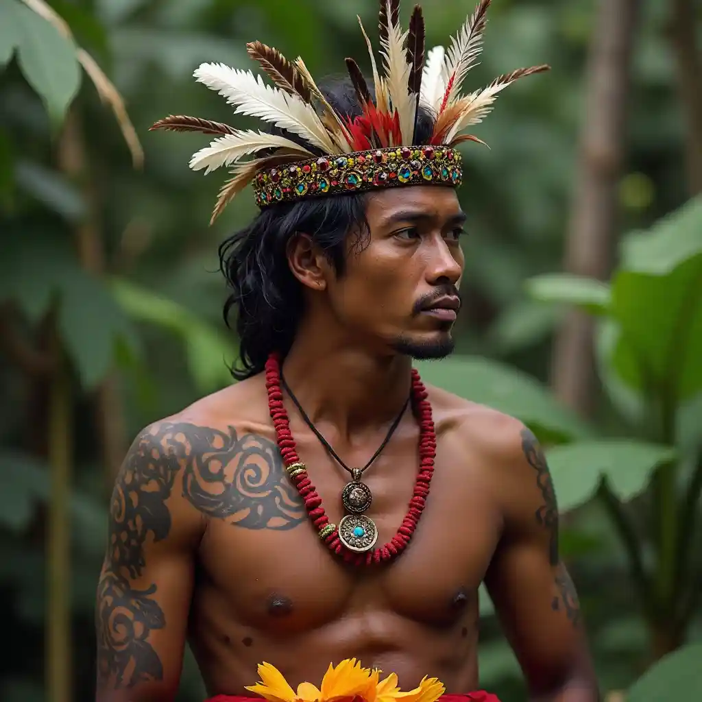 Han er brun, med sort hår, med en krone på hovedet af hvide, røde, sorte og grønne fjer med en rund krystal i midten med farverige perler på siden. Polynesiske tatoveringer over skuldre og arme, bryst. Han har røde palmemønter om halsen, og en rød gul hibiskus-sarong om taljen.