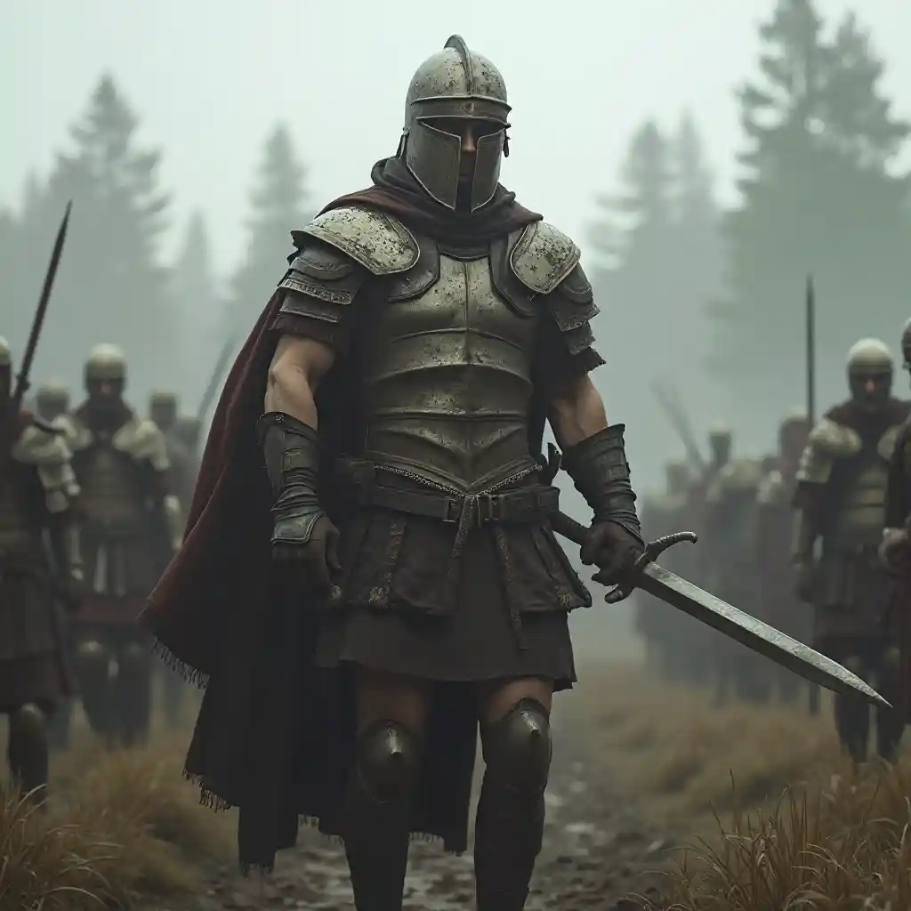 ColtonSlagmark, romersk soldat, rustning, stærk, tåge, snavs, skov, ægte, fuld krop, sværd, skjold, ar, skår