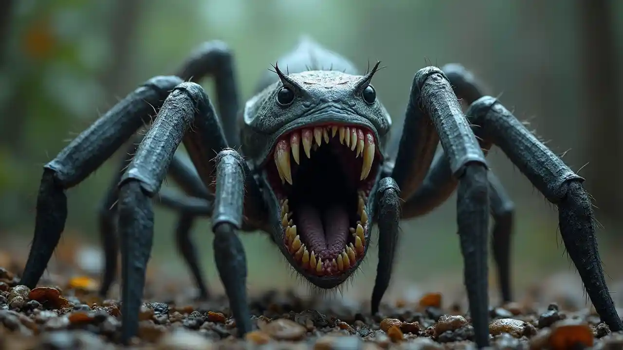 Omkring 20 gange en almindelig edderkop. Den har et hajans ansigt, en tigers tænder og har for mange tænder til at tælle, når den åbner munden.