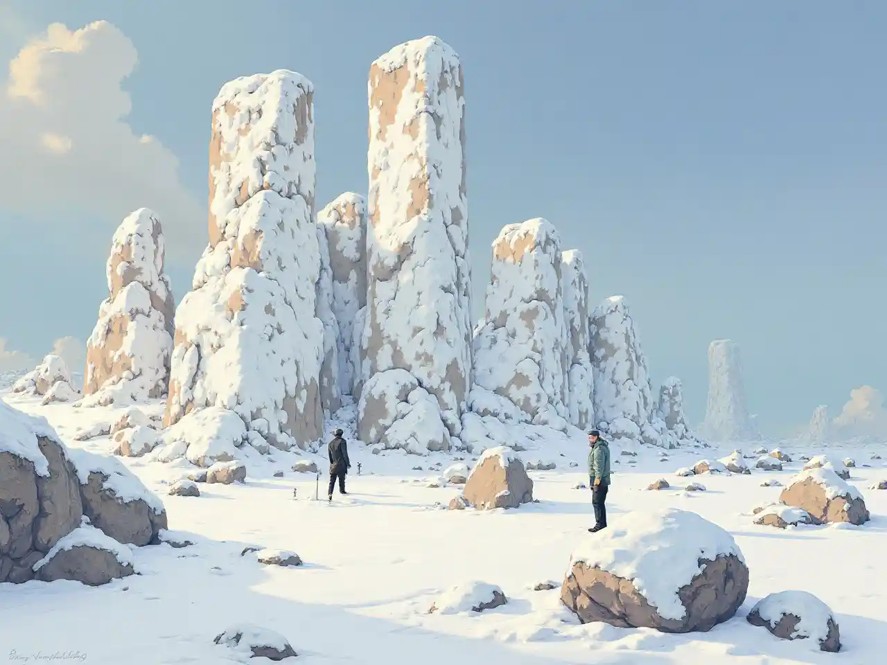 Dette kunstværk af George Wilson er en fantastisk tegning af en person, der står foran et snelagt landskab af sten og himmel.