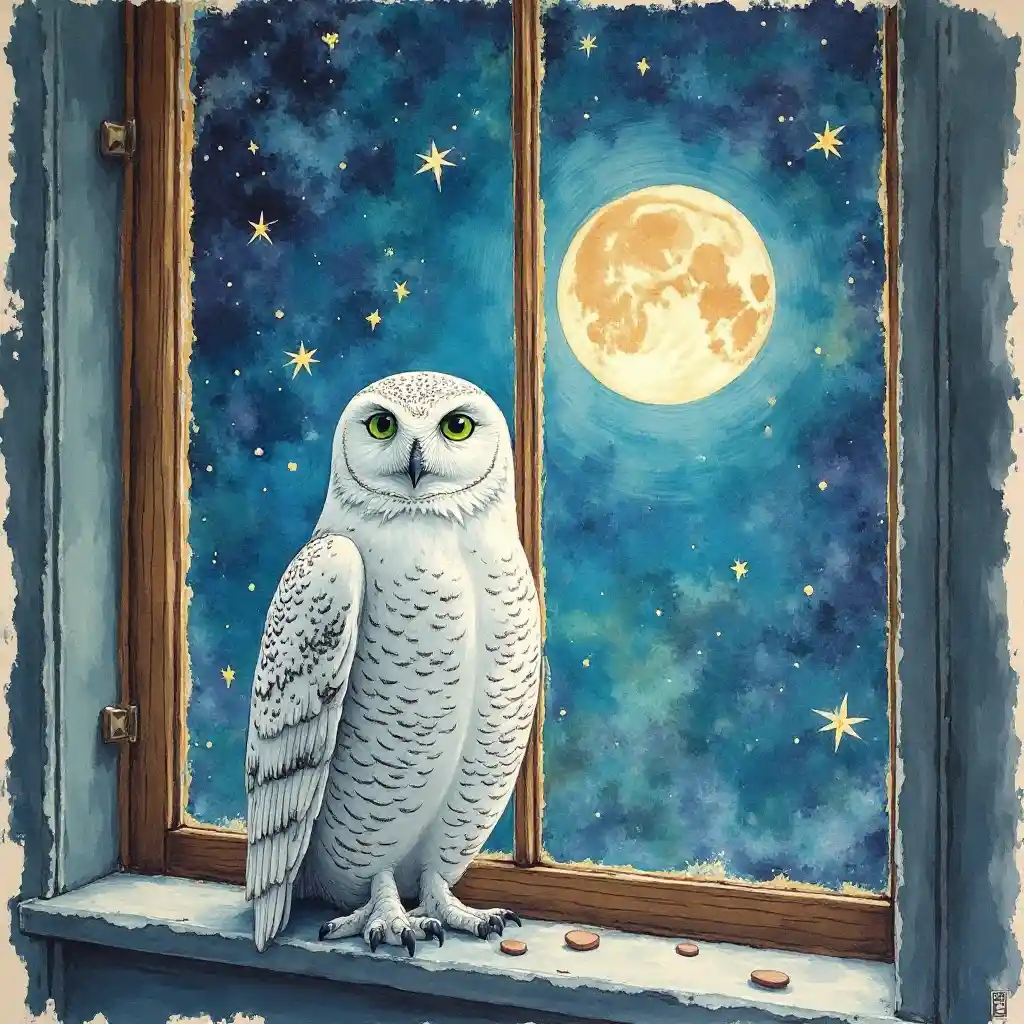 Et vintage popart-vandmaleri af en snedug med lyse grønne øjne sidder i en stor vindue og ramme. Vinduet er et farvet glas med en åbning på siden. Baggrunden er nattehimlen, en æterisk, drømmende, pastel udseende galakse og en smuk fuldmåne.
