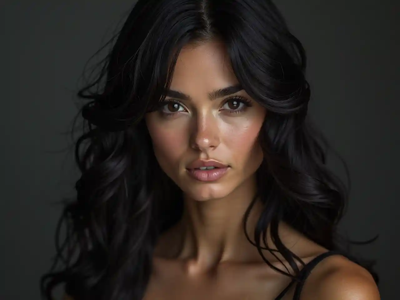 Portræt af en fantastisk spansk dame med glansende jet sort hår, der udstråler en raffineret elegance, fanget med en subtil film korn effekt, der viser høj kvalitet i et studie, fotograferet med en Nikon D850. Hendes træk blander sig med et strejf af asiatisk indflydelse, hvilket giver en unik og tiltrækning.