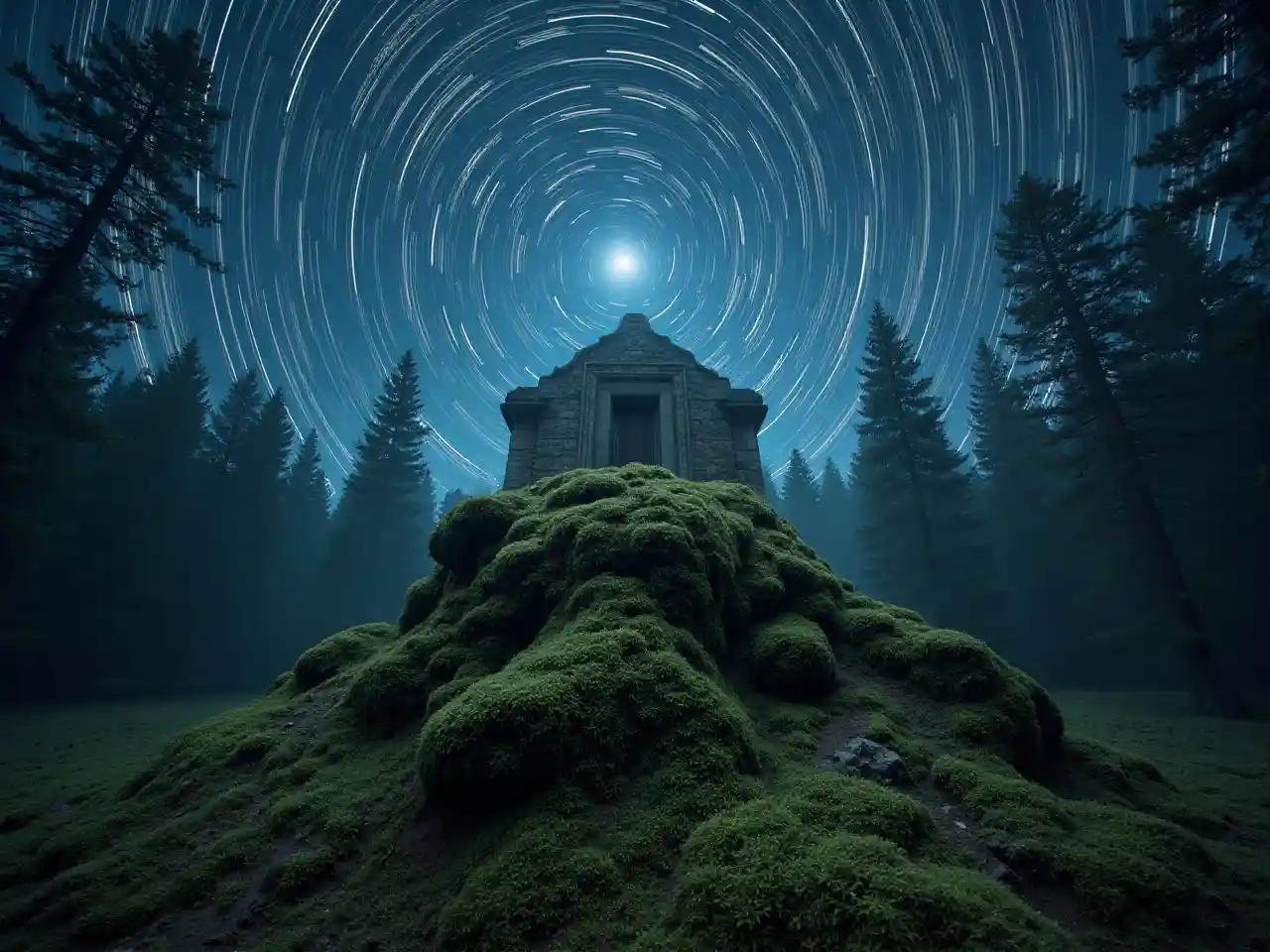 Tidssving af stjerner, der hvirvler over en mosbeklædt stenhøjde i en skovklaring, ingen synlige døre, gammel og magisk atmosfære, kameraet er låst, filmisk