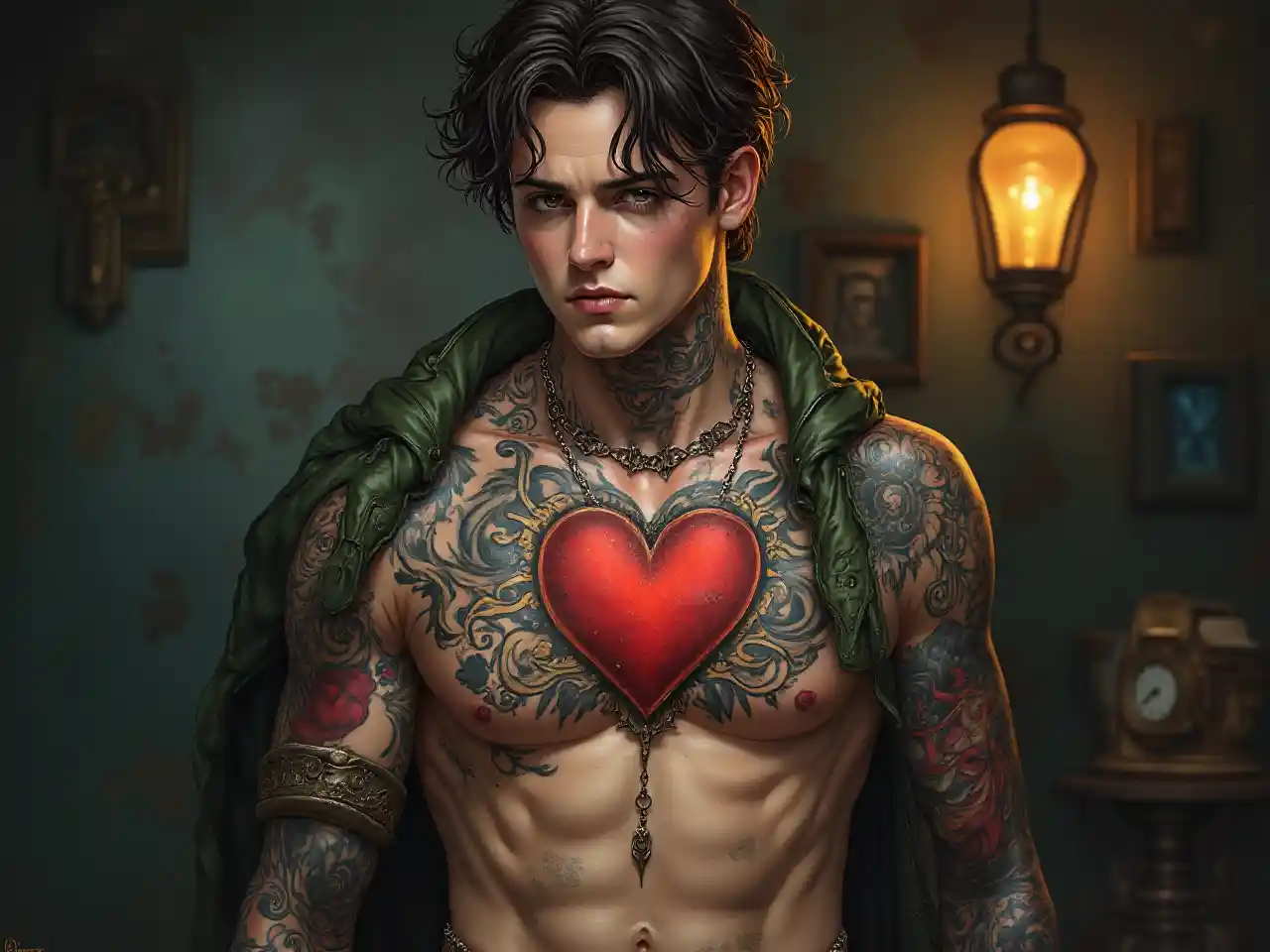 ung mand, bryst tatoveret med et hjerte, steampunk stil illustration, høj detalje, dramatisk lys