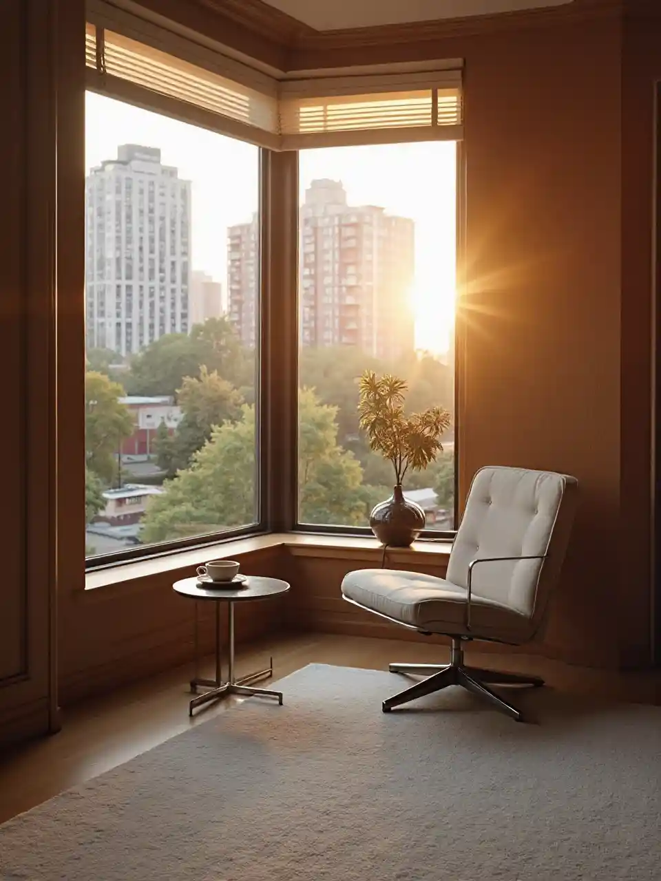 corner window of a understated luxury apartment, morning, sunrise, golden hour, calm feeling, coffee, exact same modern brazilian lounge chair of the reference image, light rug, soho new york view, playground view, a couple of trees in the playground, buildings in the view 5 stories tall. Light coming form the right side