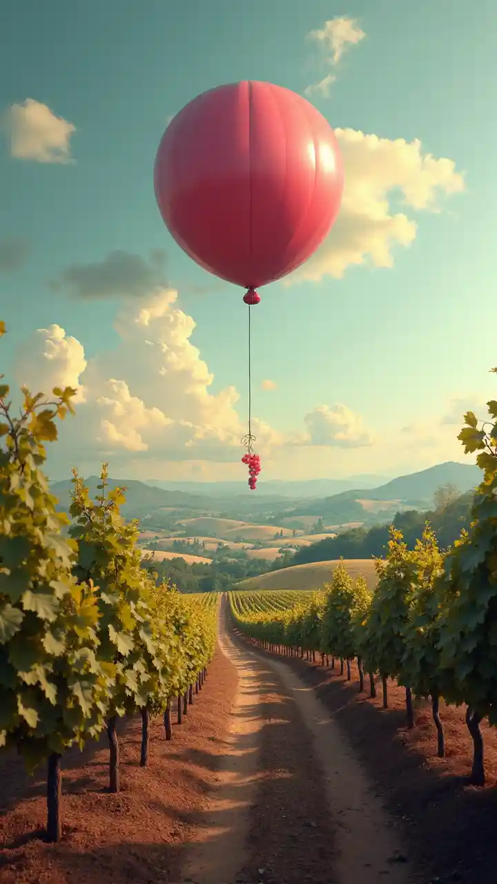 Leilasurrealist country background with vineyards and an hot air ballon make with single red grape