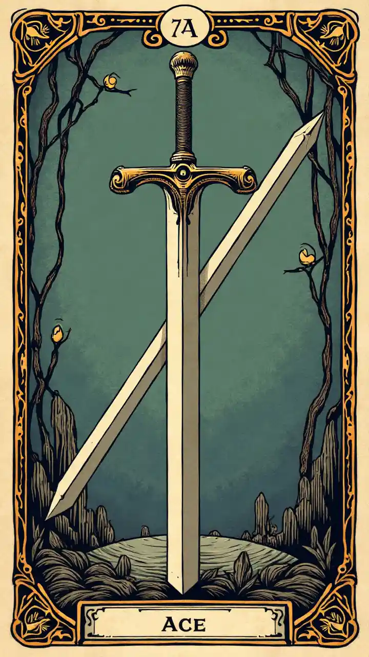 et tarotkort i forhold til 9:16 med sværdens es → Gennem samme tema genererer du et tarotkort i forhold til 9:16 med sværdens to. To af sværd tarotkort symboliserer typisk et dødvande eller en vanskelig beslutning, der skal tages. Det opstår ofte, når man står over for et valg mellem to lige tiltalende eller udfordrende muligheder, og man føler sig fast eller ikke kan fortsætte. → fjern ordet "to" fra bunden af billedet og erstatt det med ordet "tre"