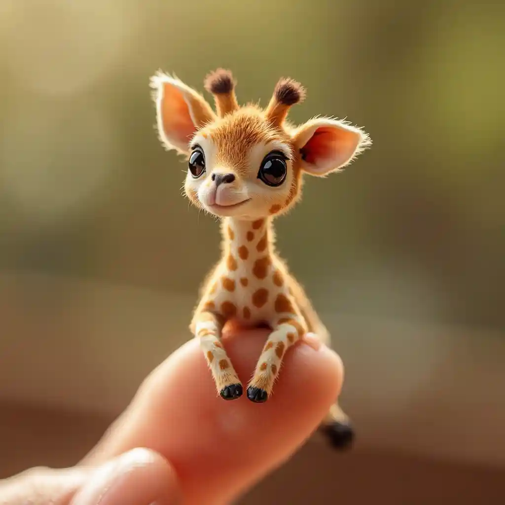 På fingerspidsen sidder en lille giraf, sød og søde, med store øjne. Billedet er taget af en professionel fotograf.