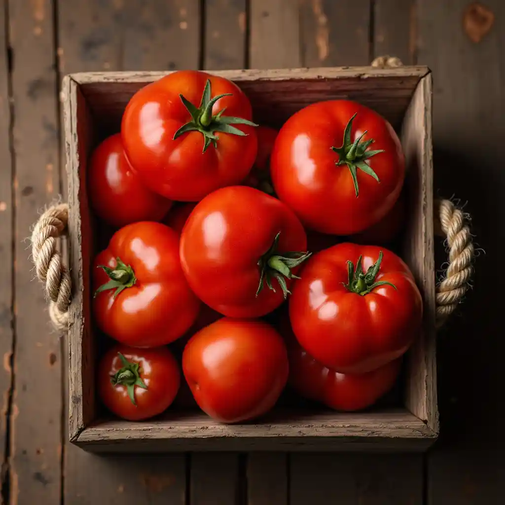 laaaara- Fra toppen. En brun trækasse fyldt med tomater, en kasse med tykke rebhåndtag, ligger på et træbord, studielys, tomaterne har en høj kvalitet skræl, Foto fra oven, topview, meget detaljeret foto, høj kvalitet foto, studio foto