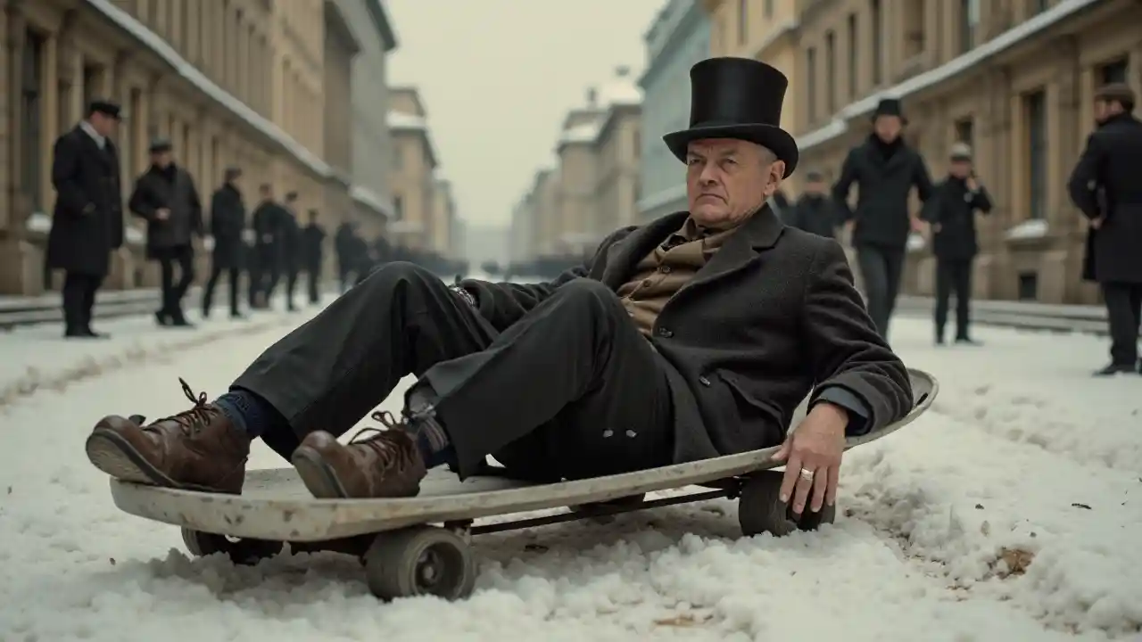 En grim gammel mand i en tophat på en sledge