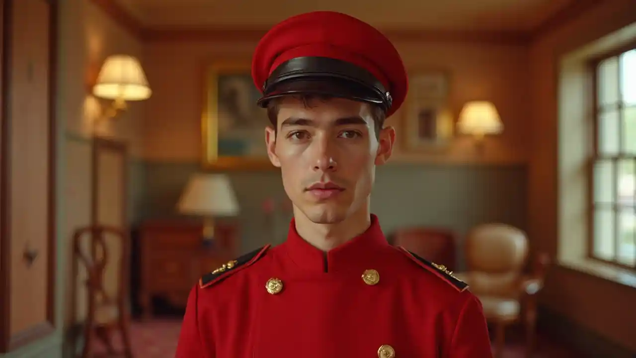 Vintage portræt af Hotel Porter i Wes Anderson stil