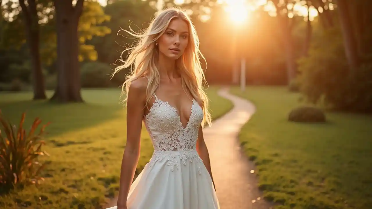 En (((meget attraktiv og smuk kvinde))) med strømmende (((lange, rodede blonde hår))), (((på en (((hvid brudekjole))), tilbehøret med ((lange, blonde bryllups slør))), og elegant, ((sorte suede højhælede)) poseret med tillid midt i en malerisk ((bryllsel admirals park)) hvor den bløde glød af en solnedgang skaber en varm, hyggelig atmosfære