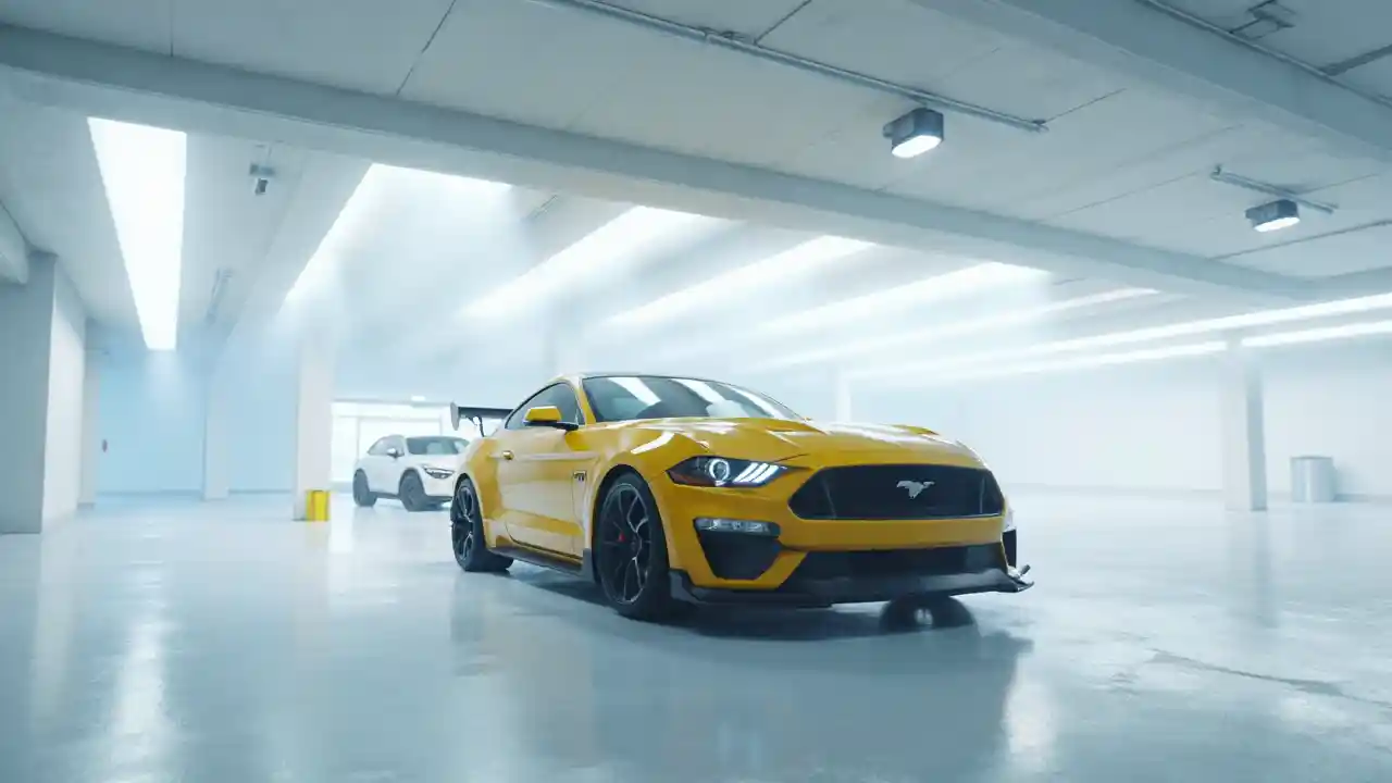 Et videospil baggrundsbillede af en hvid ren garage, hvid neonlys, Asphalt 9 legends stil, en gul Mustang bil i forgrunden, utrolig grafik, 4k