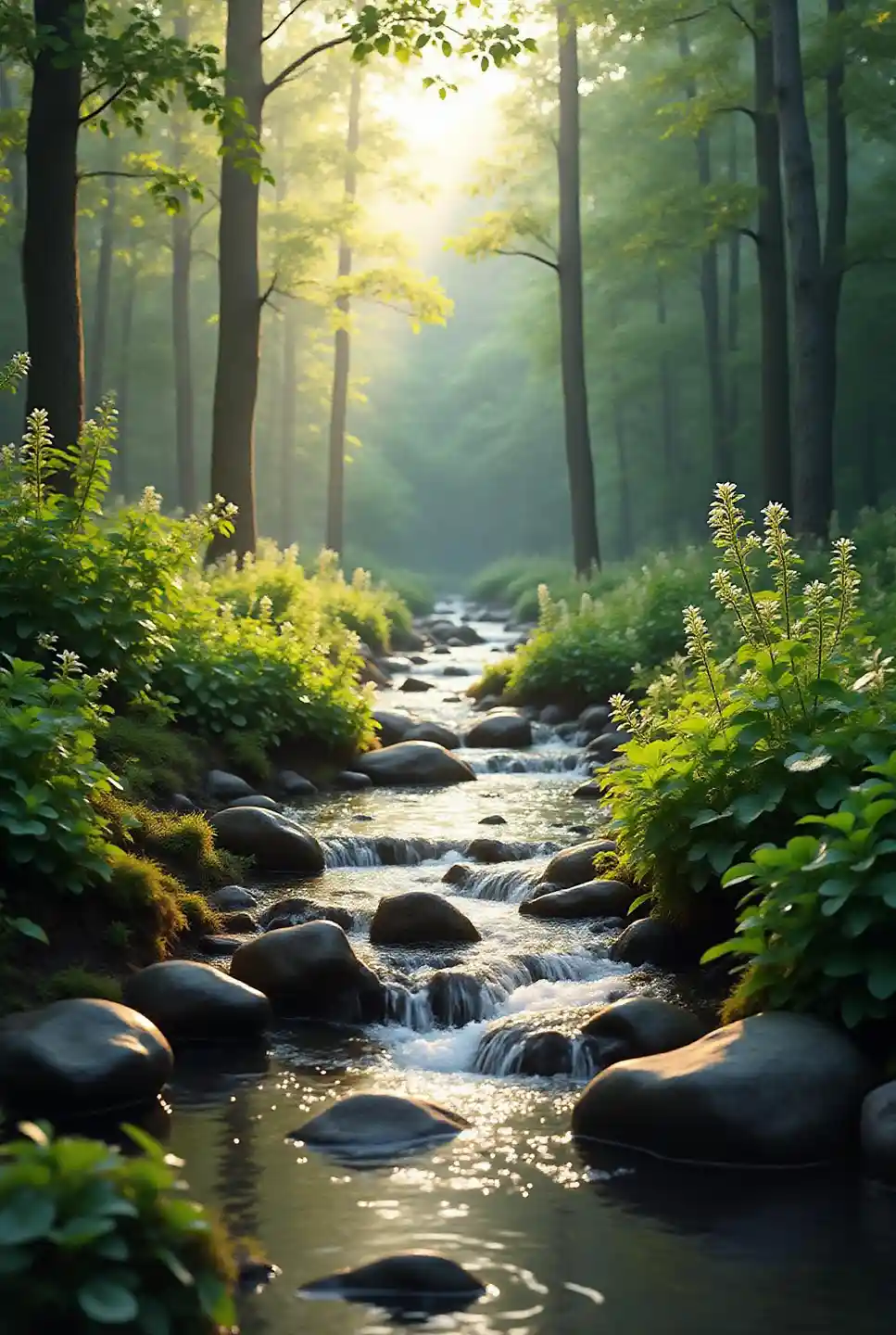 LucasEn smuk bro af tråde og stenplader, et vildt land, en flod med en hurtig strøm, vilde urter og planter, solens lys falder på dagdråber, der skinner i det grønne