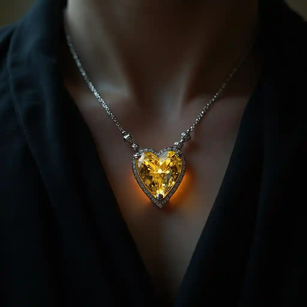 En hjerteformet, briljantskåret gul diamanthalskæde til en mandlig karakter. Den gule diamant er uden fejl og vejer 45,52 karat (9,10 gram), hvilket er samme størrelse som Hope-diamanten. Juvelen er monteret i platin med delikat rullemaskin og beskyttende magiske runer graveret i metallet. Kæden er platin, elegant men maskulin, og den er indrettet med små hvide diamanter langs. Halskæden hviler på brystet af en ung mandlig troldmand iført formelle sorte klæder, i et svagt oplyst, magisk miljø. Ædelstenen skinner varmt og reflekterer guld. Stil: Ultra-detaljeret, fantasy-realisme, filmatisk belysning