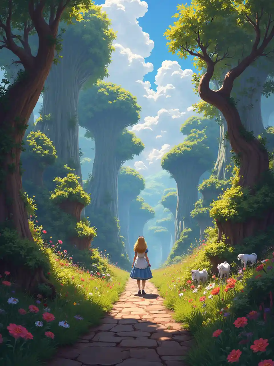 Alice i vidunderlandet, levende farver, vidvinkel, super detaljeret, professionel digital maleri, koncept kunst,