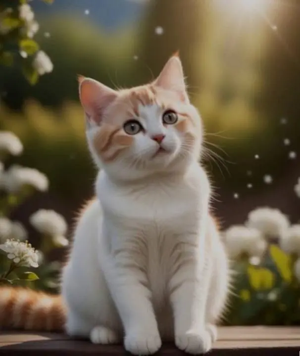 En legende hvid og orange killing, der ligger på en træoverflade, der udstråler charme midt i en baggrund af fine hvide blomster. Solens lys danser rundt og giver et varmt lys der forstærker den fortryllende scene. Pludselig får denne skønne pelskugle alle opmærksomhed med sin bemærkelsesværdige evne til at efterligne lyde! Hver gang den hælder hovedet og ryster ørerne, synes den at deltage i en glad samtale og fortrylle alle med sine fortryllende antics. Denne fluffy følgesvend er en perfekt blanding af sødme og teknologi. Se magien, når denne lille katte-kæreste ser ud til at synge og chatte, hvilket skaber en uforglemmelig oplevelse, der garanterer, at du smiler!